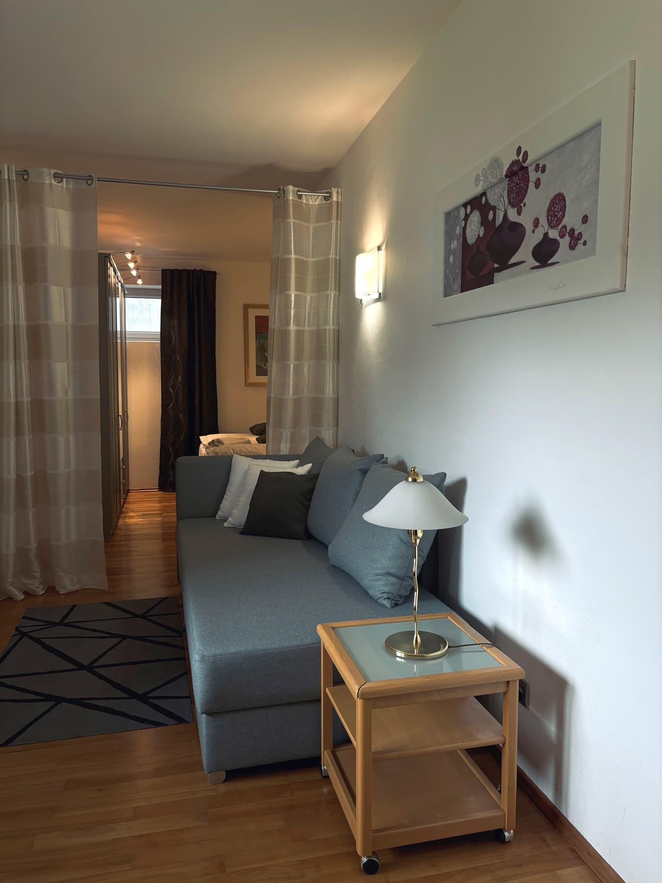 Our studios for 2 people are equipped with allergen-free wooden floors and furniture. The fully equipped kitchen and large dining table let you cook for yourself as you wish. You'll sleep on either a high-quality JOKA pull-out couch with an integrated mattress that converts into a double bed or in the cozy box-spring bed. All studios come with a spacious balcony offering panoramic views.